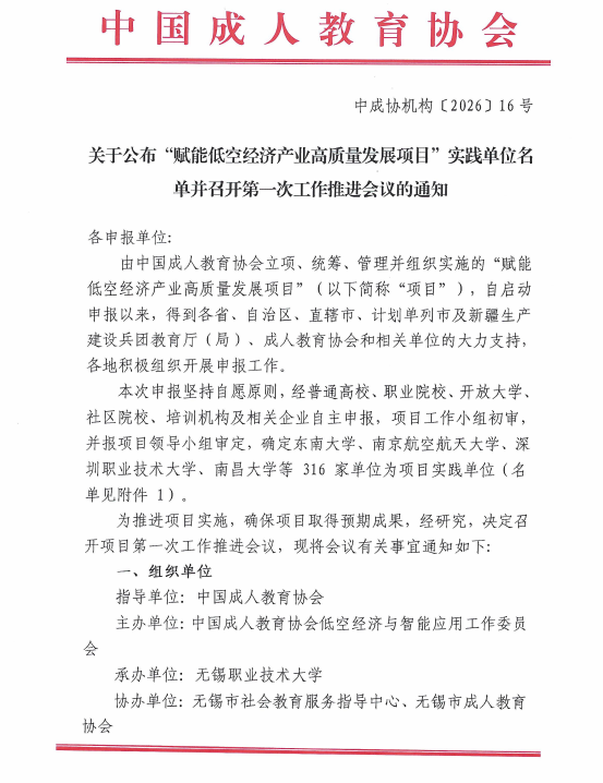 近日,教育部中国成人教育协会正式公布“赋能低空经济产业高质量发展项目”实践单位名单,我校凭借鲜明的信息特色、深厚的产教融合积淀及服务区域经济发展的突出能力,成功入选。此次入选,是学校主动对接国家低空经济发展战略、深化产教融合、培育高素质技术