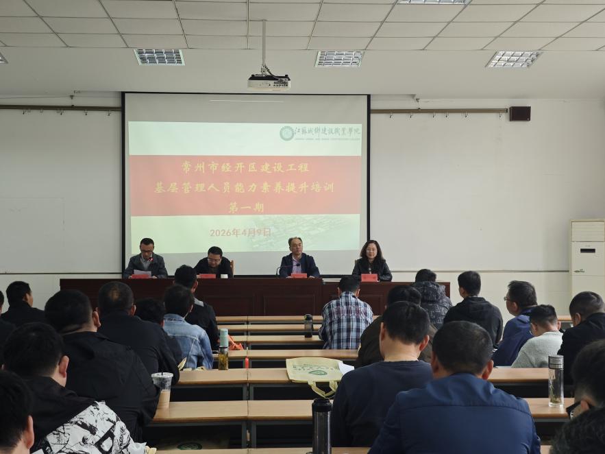 4月9-10日,2026年常州市经开区建设工程基层管理人员能力素养提升首期培训班在我校开班。常州市经开区建设和交通局建管中心主任邹优、副主任李晓波,我校袁乐副校长、继续教育学院院长许明及全区80余名建设工程管理骨干参加开班动员。动员会上,袁
