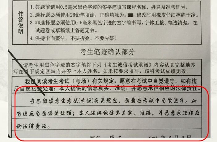 4.准考证号、姓名和笔迹信息采集等内容,必须清楚、准确、完整填写。信息填写错误、不清,或未按要求填写笔迹信息采集内容的,当场考试成绩无效。参考下图所示: