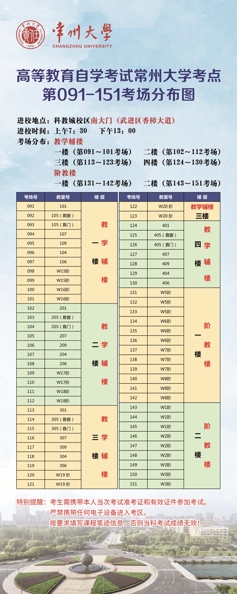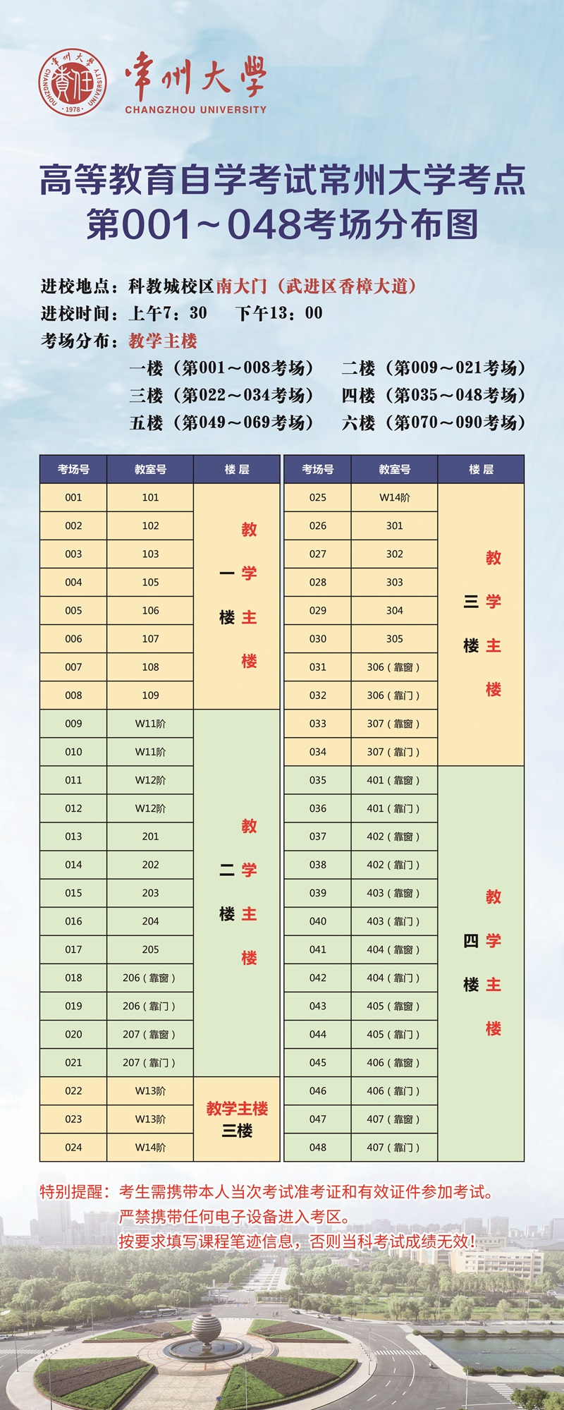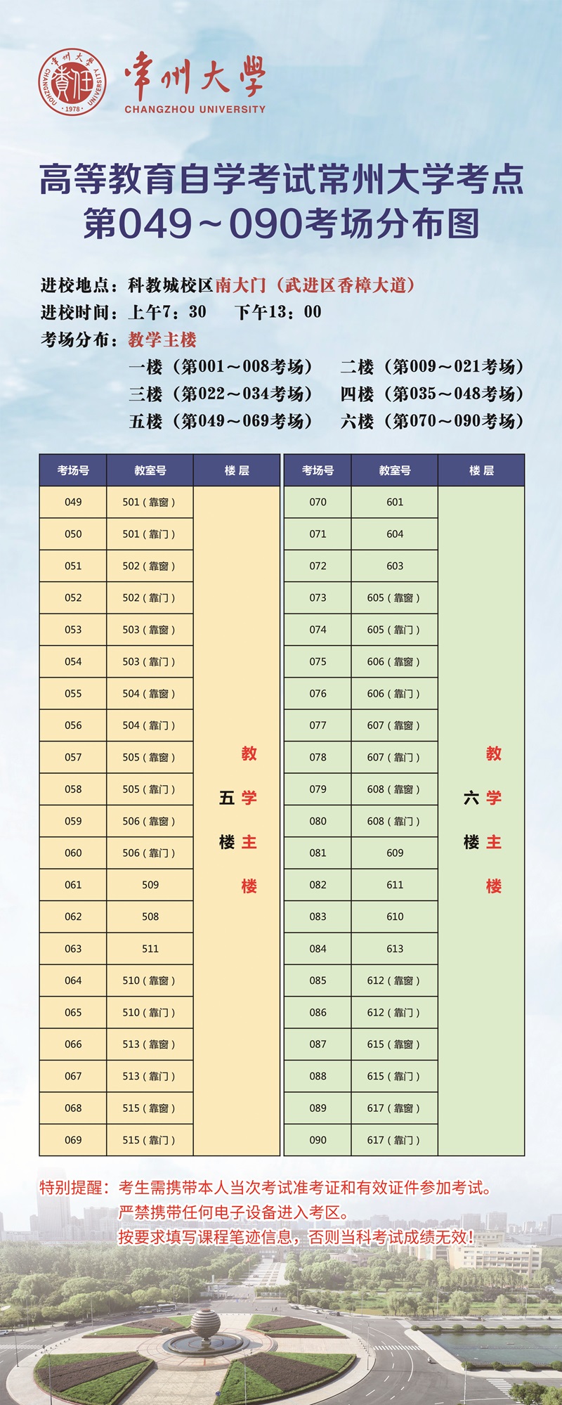 十、合理规划来校时间,注意考试途中安全,提前关注“常州大学考点考场分布图”和“常州大学考点平面示意图”。