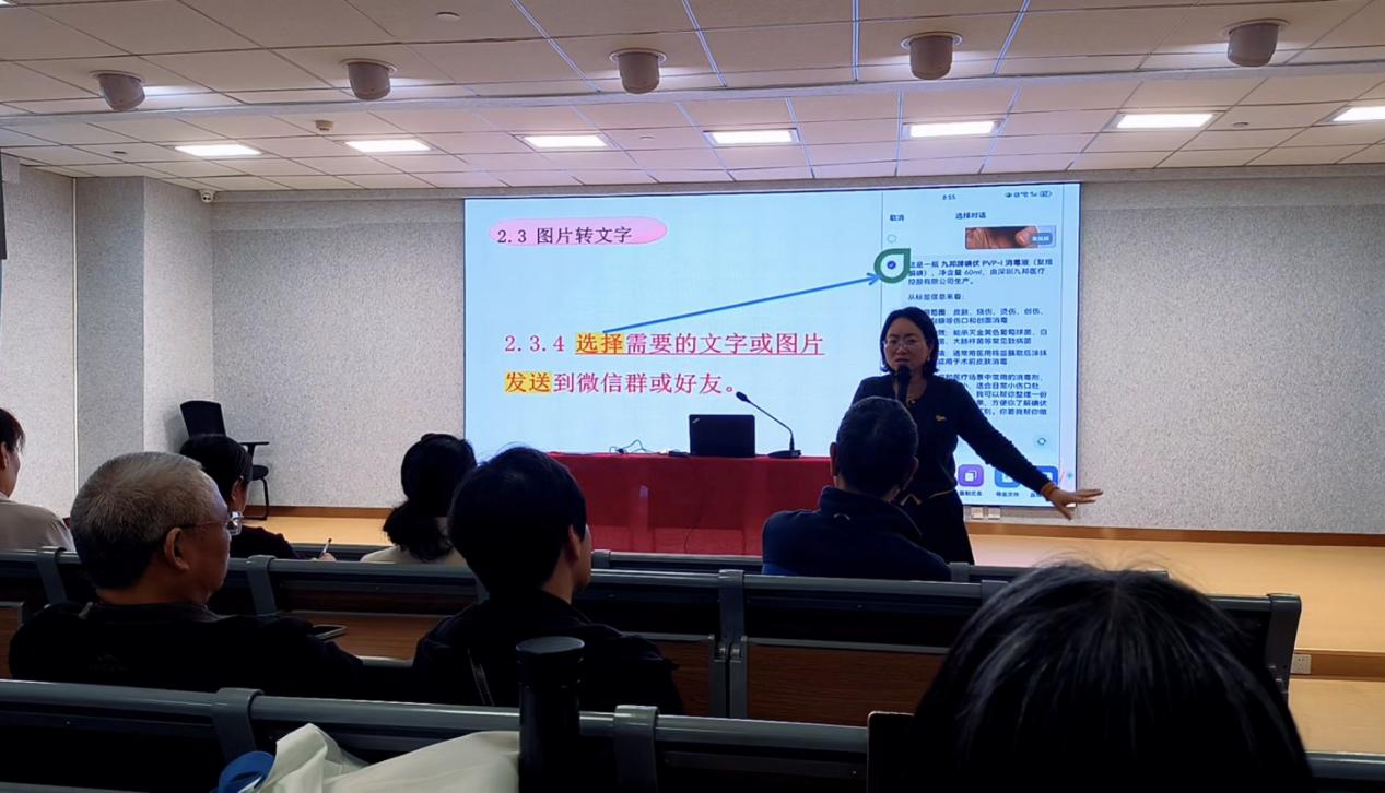 讲座中,孟老师以“手把手教学、内容易懂、技能可学”为原则,用通俗语言拆解AI工具“豆包”的实用功能:从适老化设置(调大字号、简化界面),到图片转文字实操(药盒说明、说明书一键转文字),再到核心的体检报告智能解读——逐步指导学员上传报告、提取数据,清晰讲解异常指标的健康风险与基础应对方法。